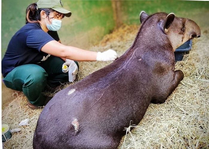 De acordo com o Núcleo da Floresta, os profissionais monitoram o estado de saúde da anta enquanto ela permanece sob cuidados no centro de reabilitação.