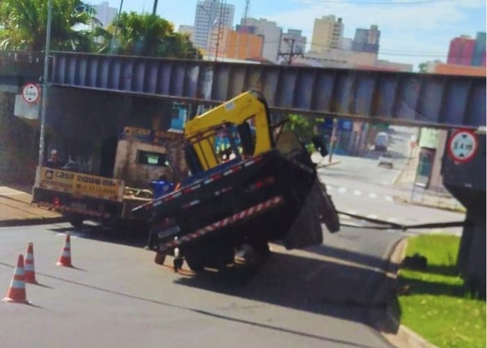Um caminhão ficou preso no pontilhão do cruzamento entre a Avenida General Osório e a Avenida Afonso Vergueiro, por volta das 8h15 desta terça-feira (17), na região central da cidade, após tentar passar mesmo excedendo a altura máxima permitida de 3,40 metros. O veículo estava descarregado e, apesar do impacto, ninguém ficou ferido.