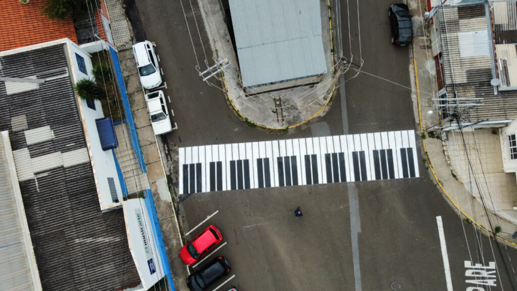 A nova faixa, localizada na rua Manoel Gonçalves, utiliza a arte para chamar a atenção dos motoristas. O formato de teclado de piano não tem apenas função estética: intervenções criativas no asfalto tendem a despertar mais cuidado na aproximação, contribuindo para a redução da velocidade.