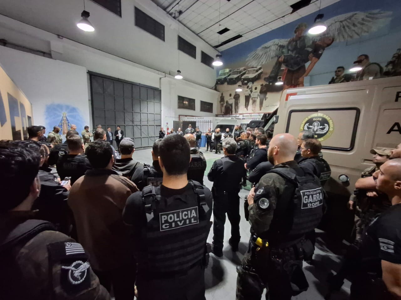 A operação contou com 97 policiais civis e apoio de unidades especializadas como a Divisão Estadual de Investigações Criminais (Deic), o Grupo Especial de Reação (GER) e o Grupo Armado de Repressão a Roubos e Assaltos (Garra). As ações continuam em andamento.