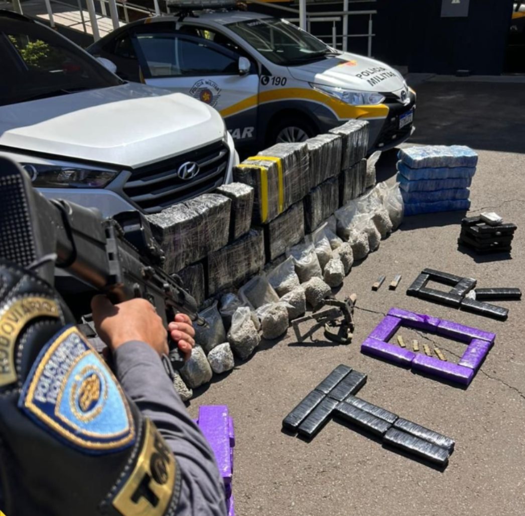 Durante abordagem na Rodovia Castelo Branco, PMs apreenderam maconha, metralhadora e veículo furtado